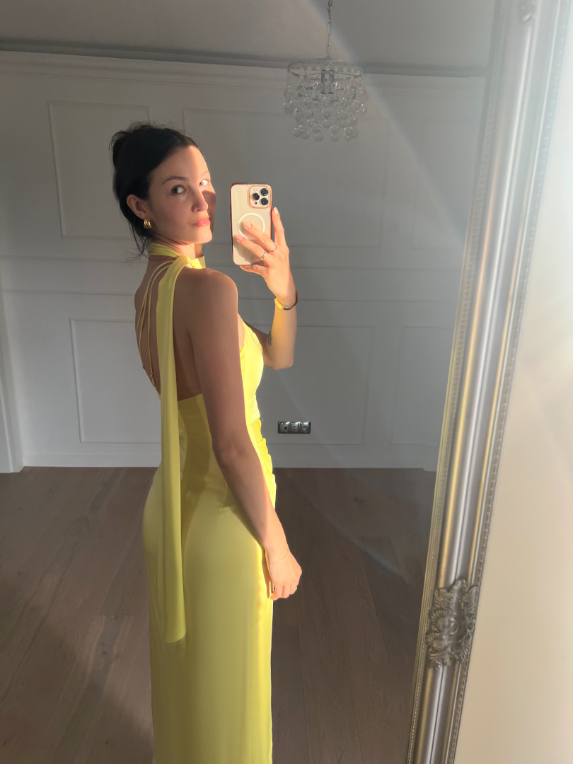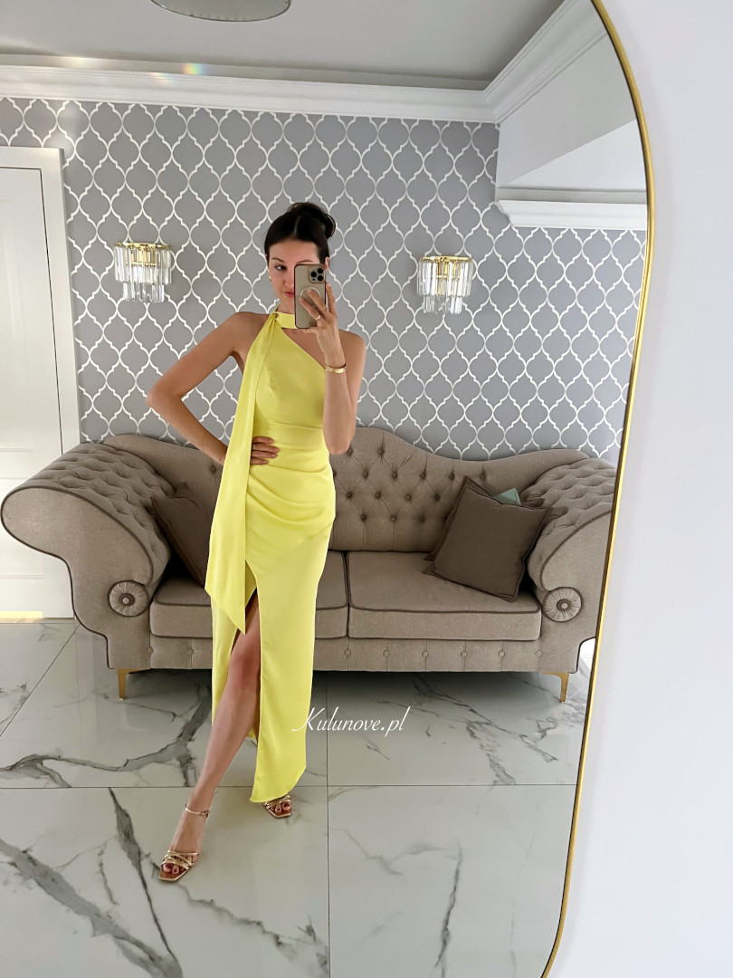Satynowa sukienka o długości maxi w kolorze cytrynowym.