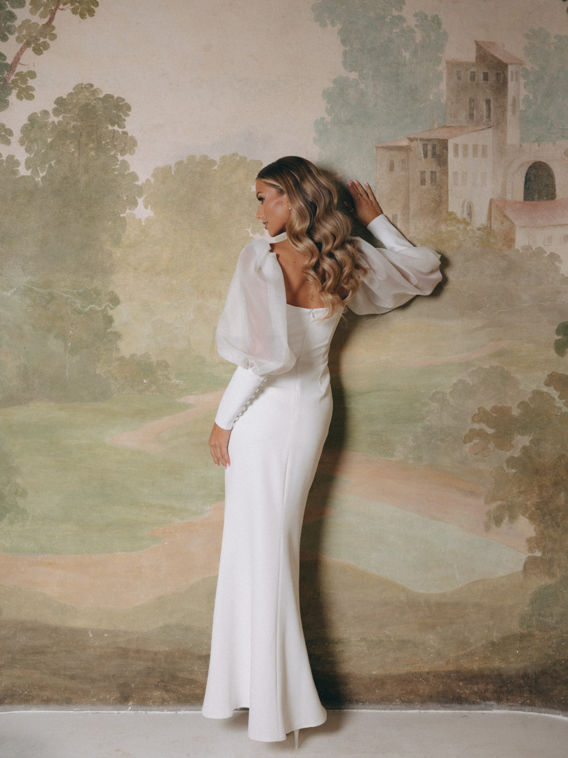 Długie bufiaste rękawy nadają stylizacji romantycznego charakteru i tworzą harmonijny kontrast z dopasowaną talią.
