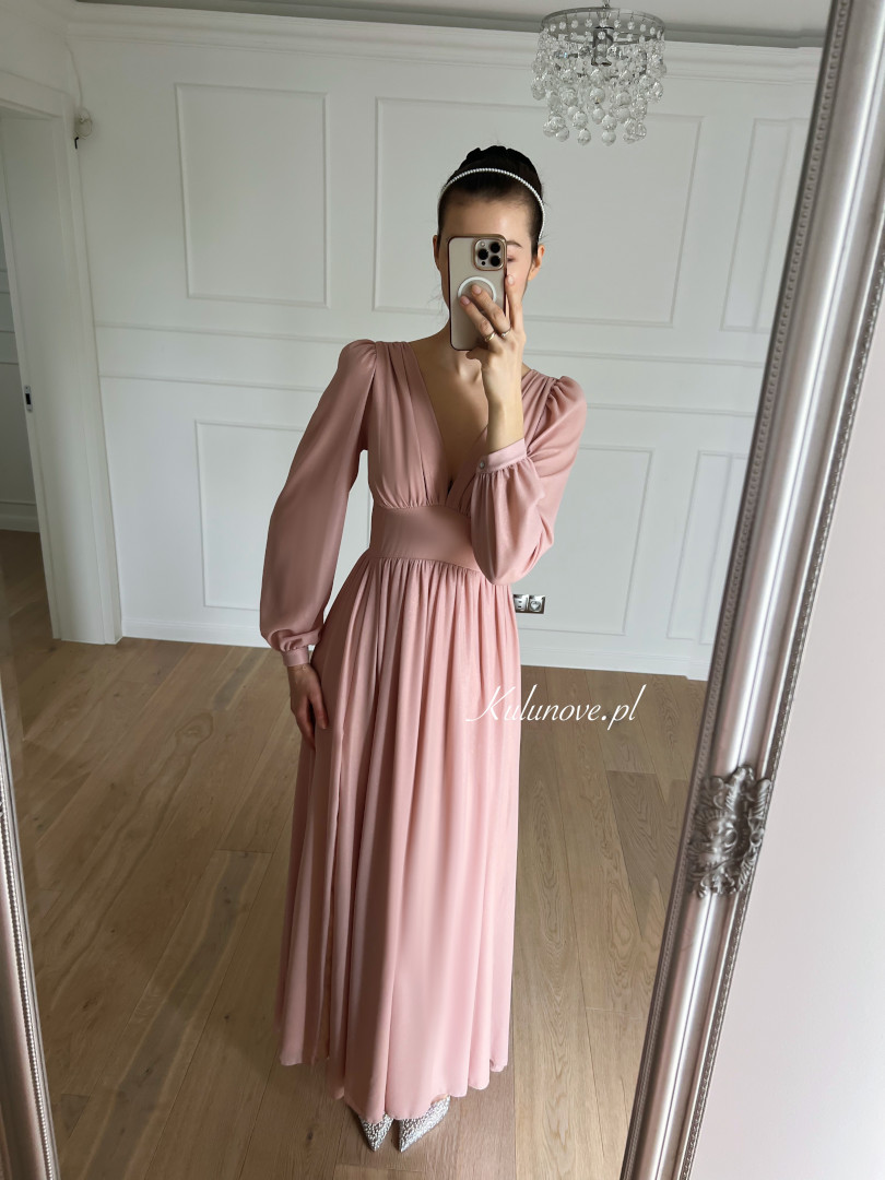 Długa, prosta suknia z szyfonowymi, bufiastymi rękawami.