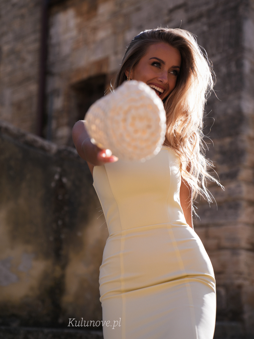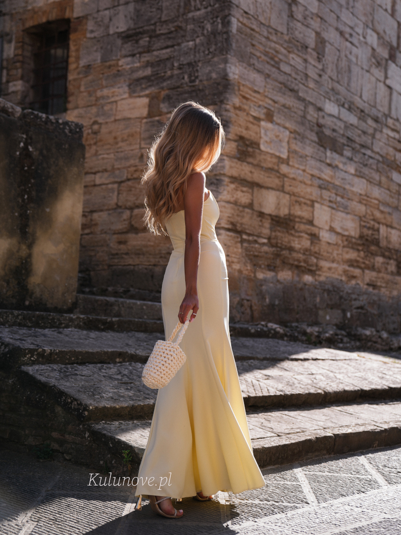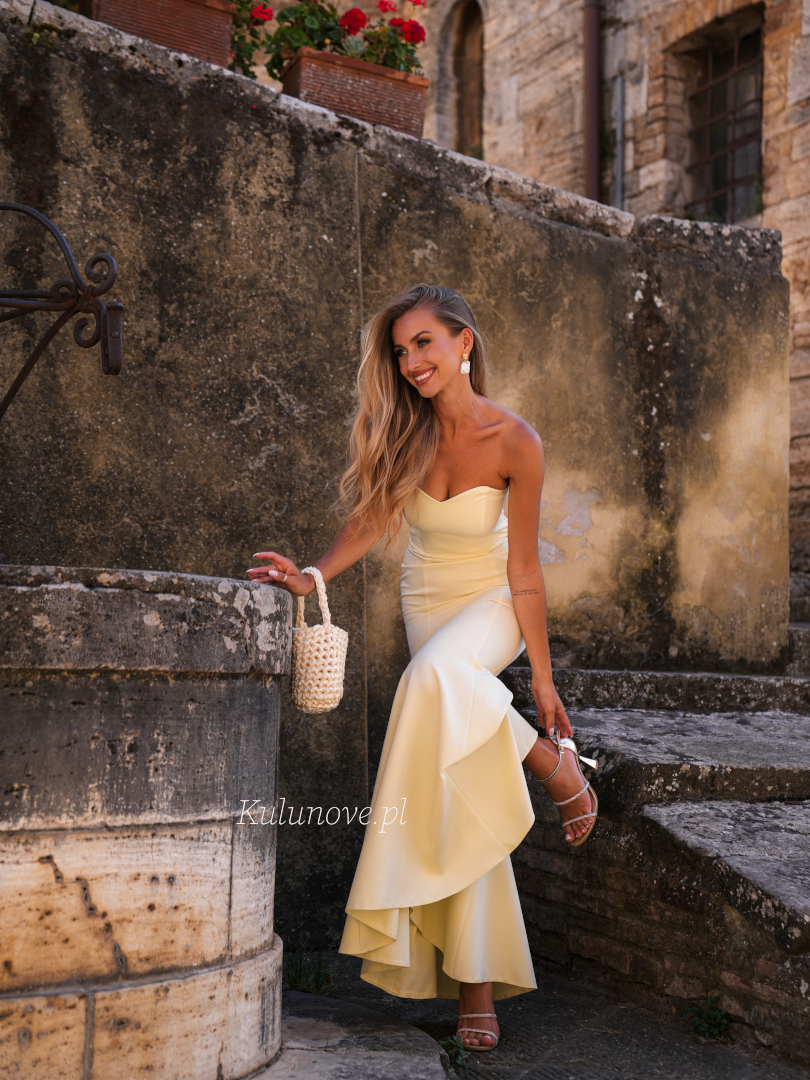 Monalisa - żółta dopasowana sukienka w kształcie rybki i dekoltem w serce