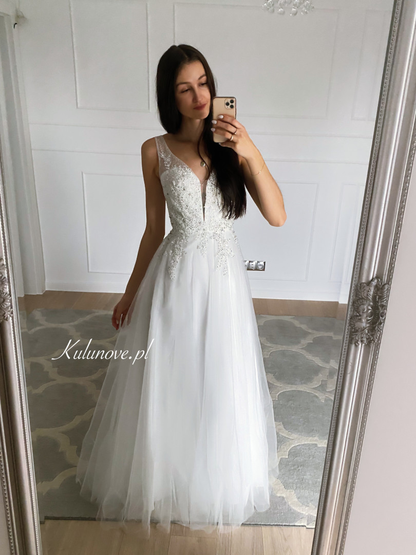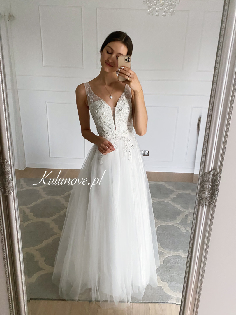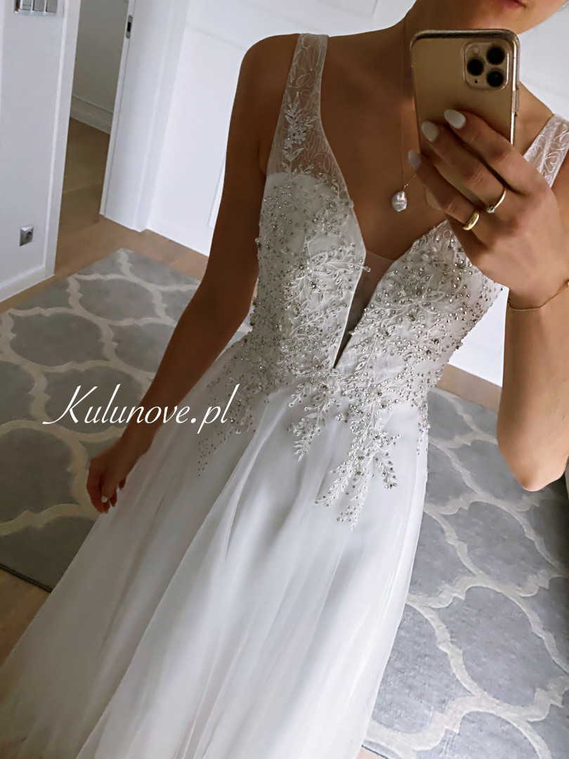 Niesamowita suknia z piękną zdobioną górą - idealna na ślub.