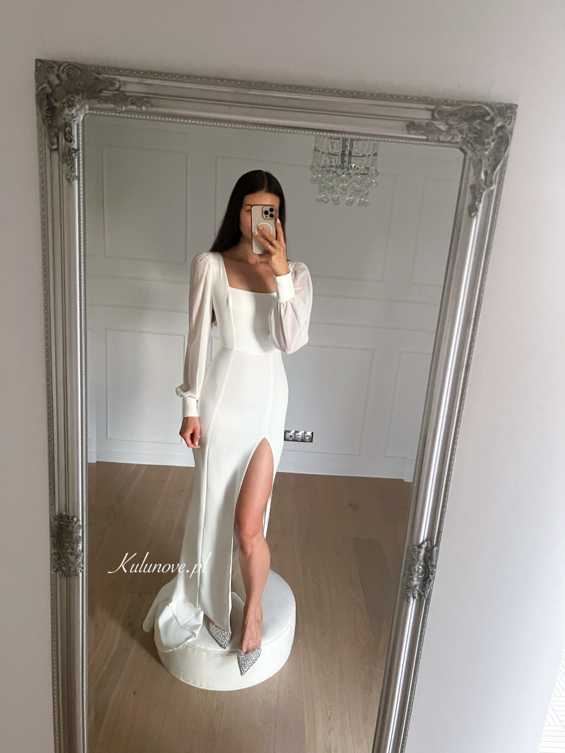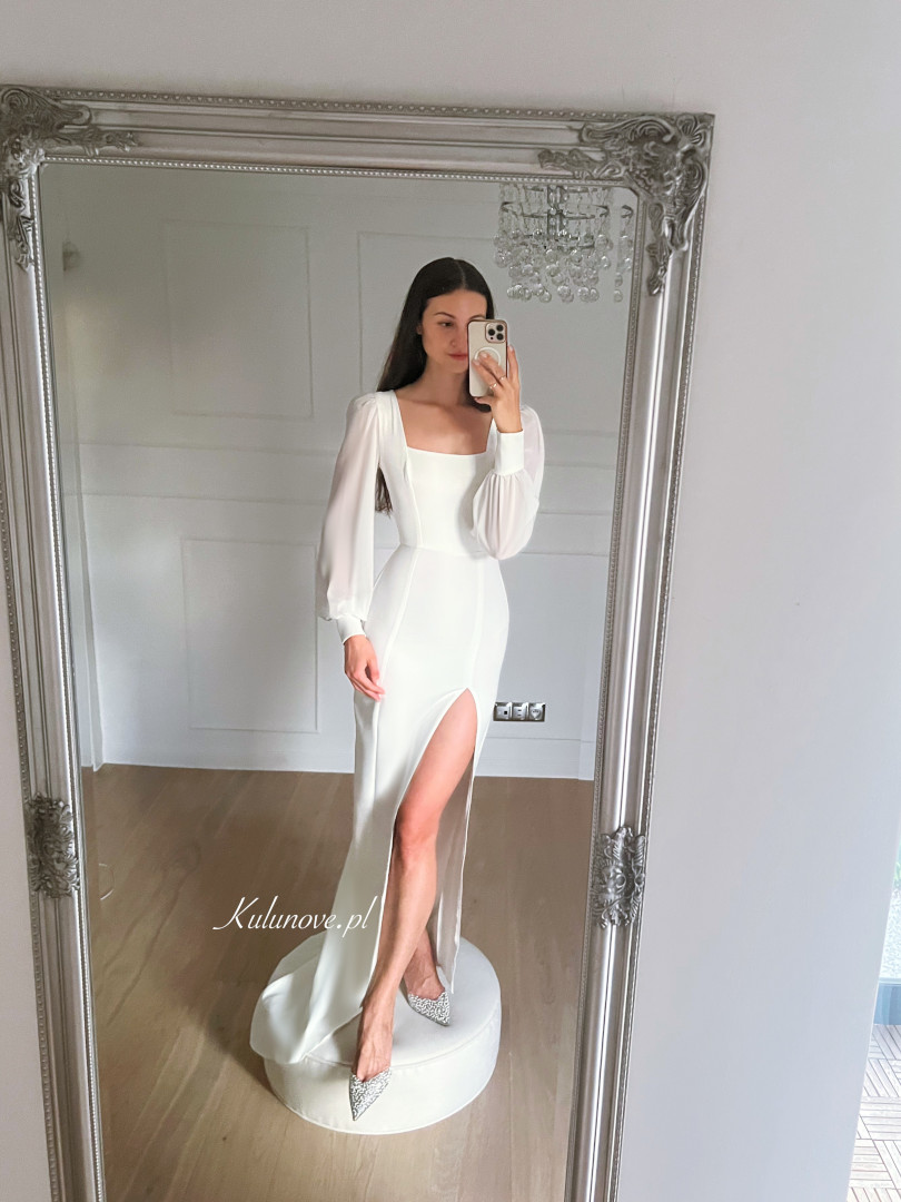 Nerra - minimalistyczna gładka suknia ślubna o kroju rybki na długi rękaw z dekoltem na plecach