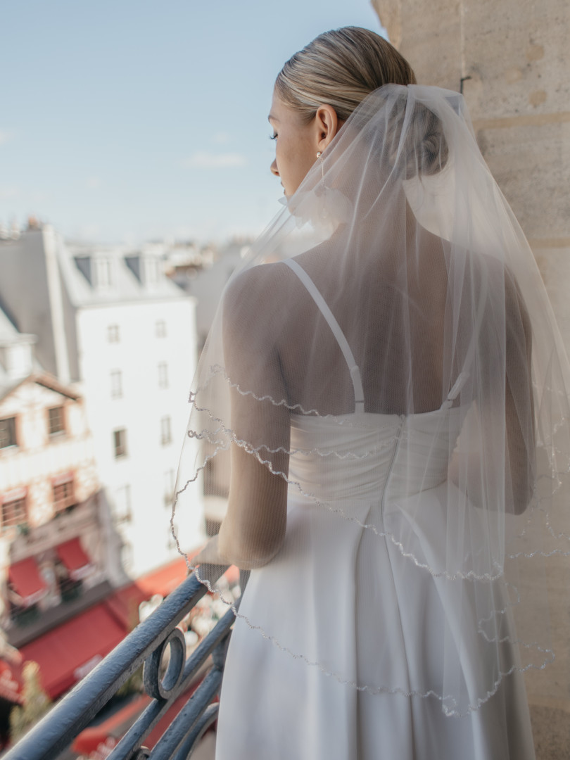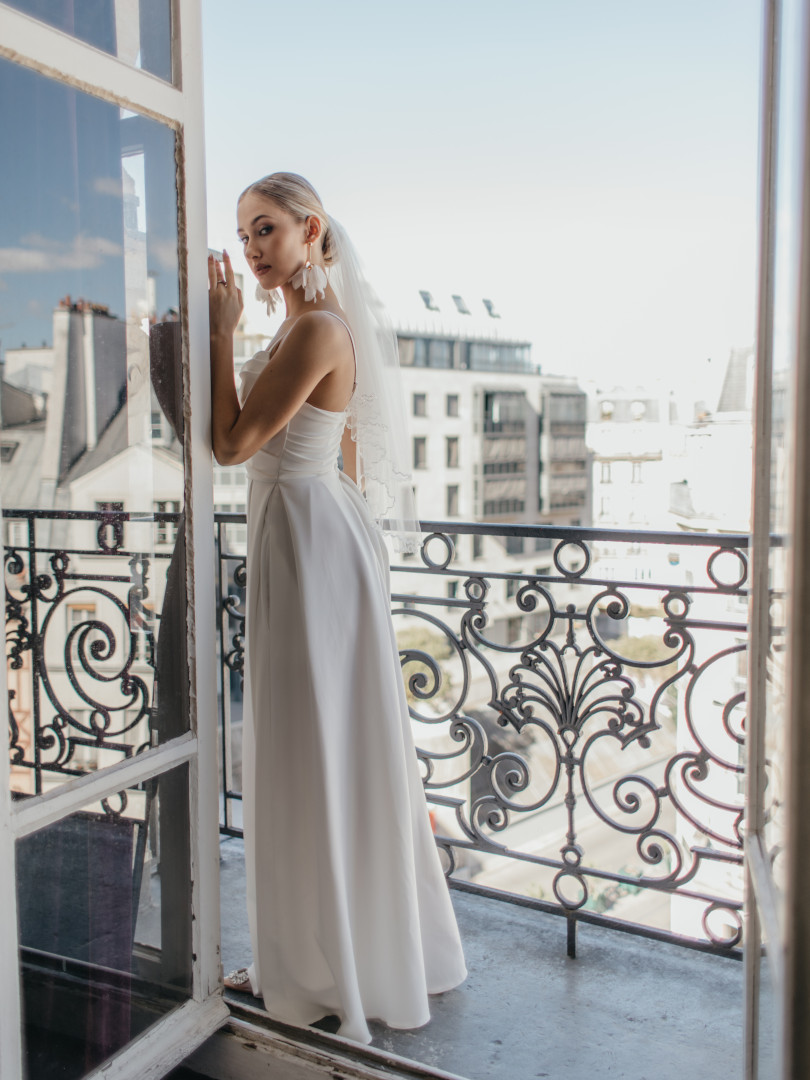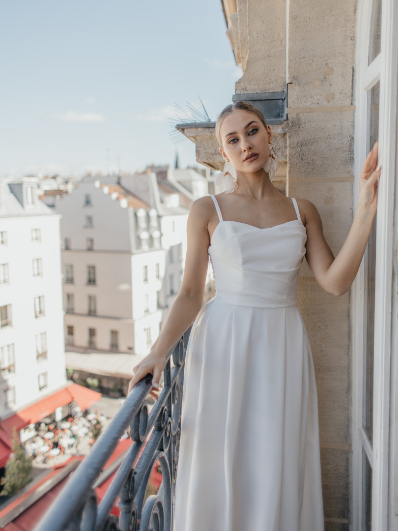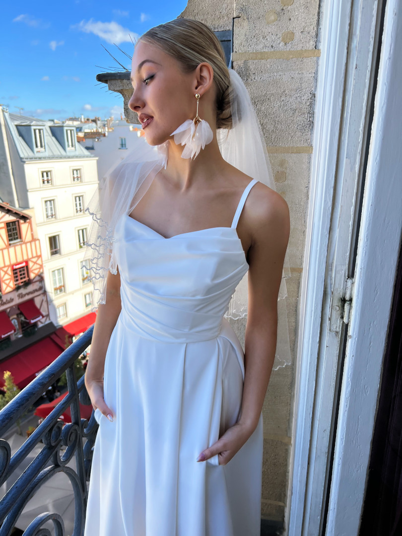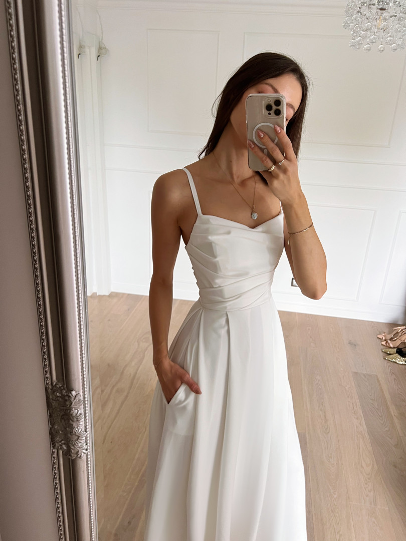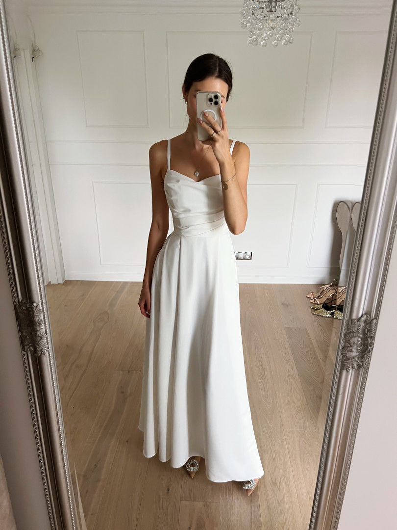 Suknia w kształcie litery A w kolorze śmietankowym.