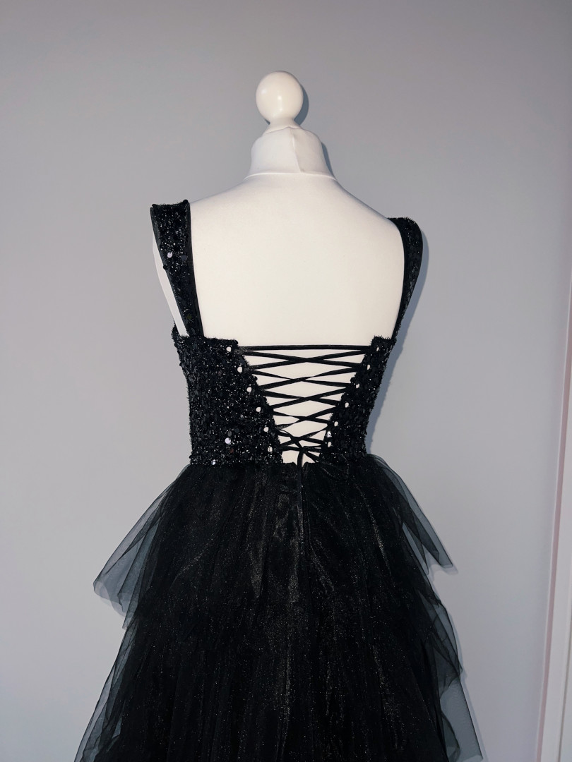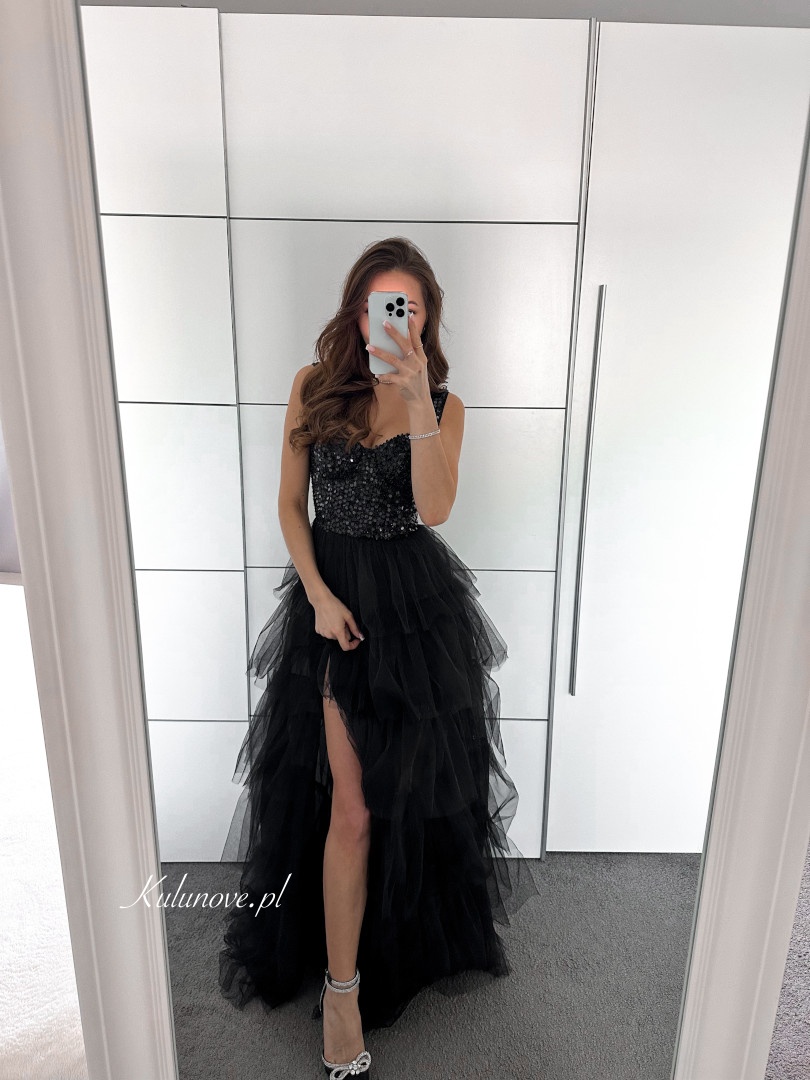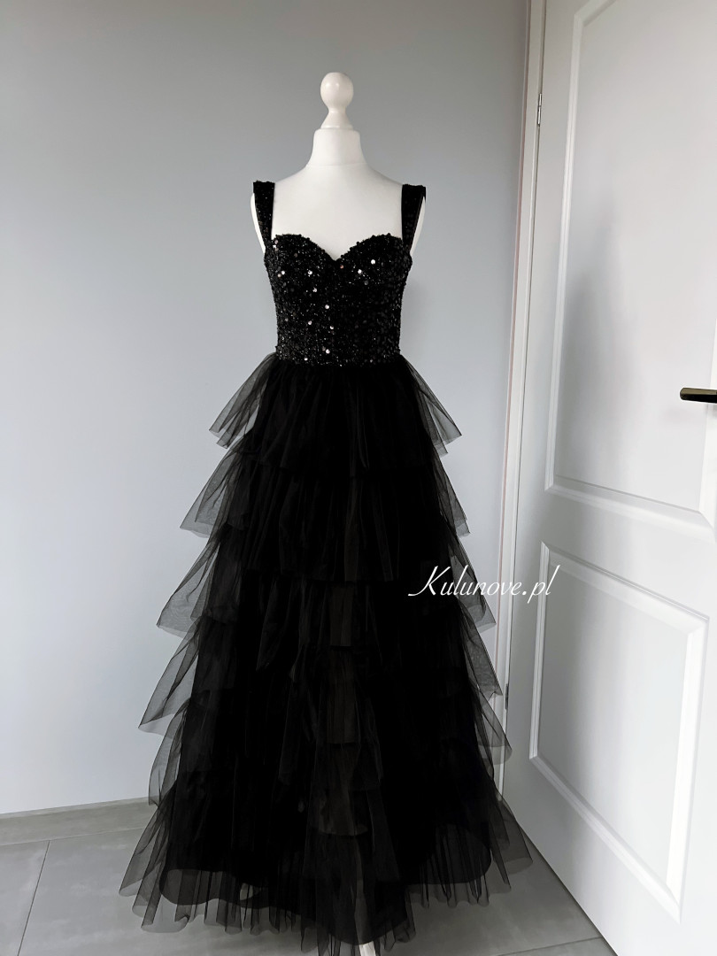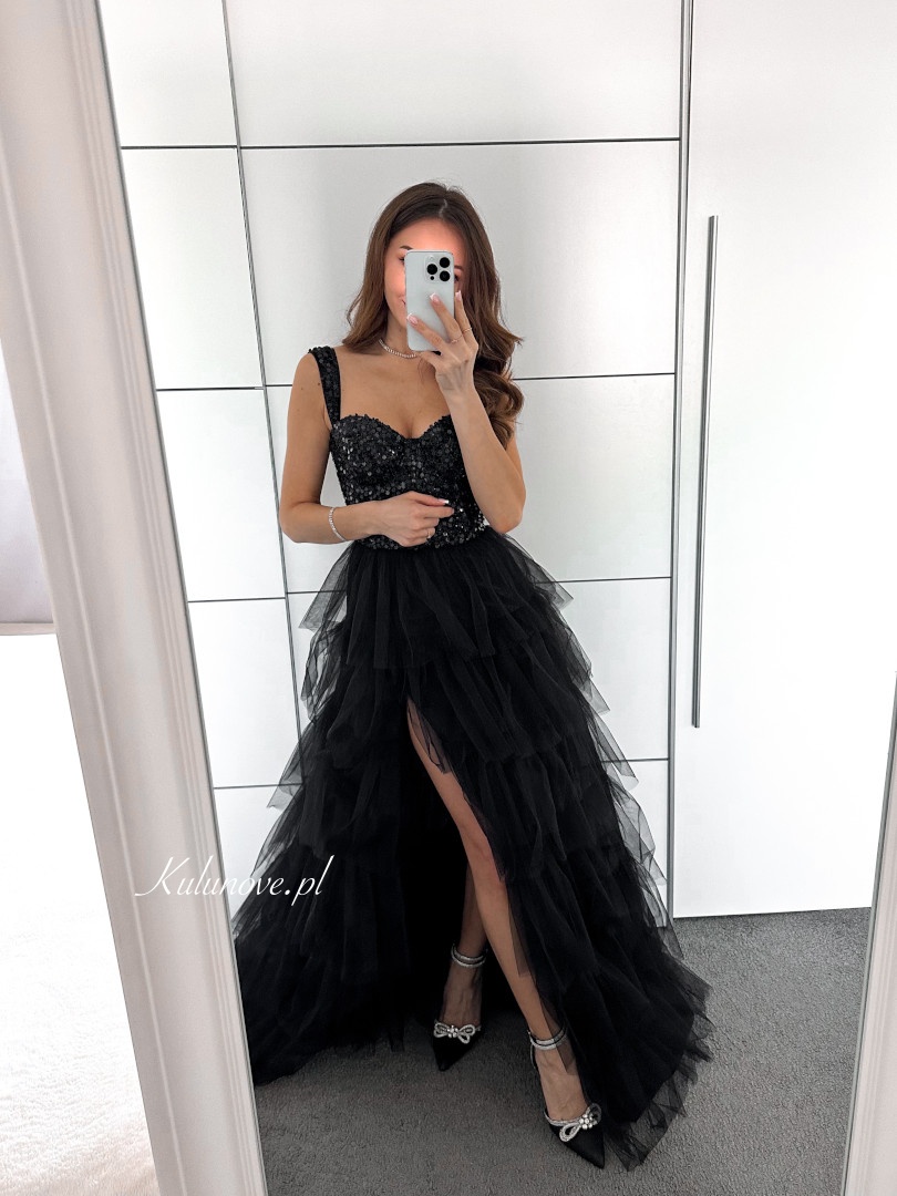 Oktavia II - czarna długa sukienka z cekinowym gorsetem z falbaniastym dołem