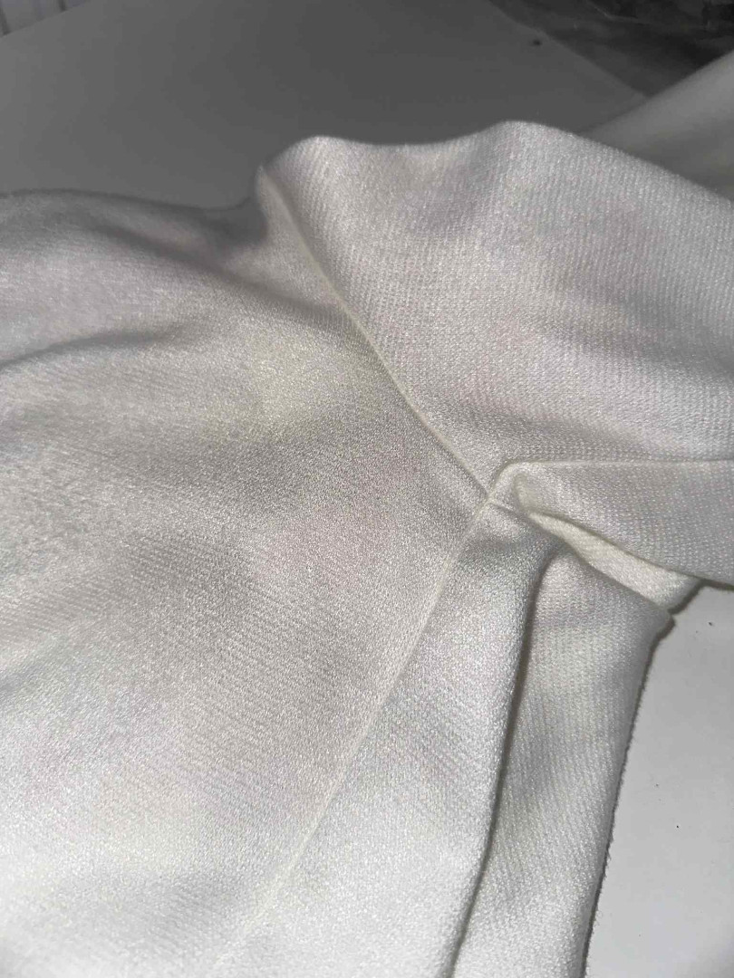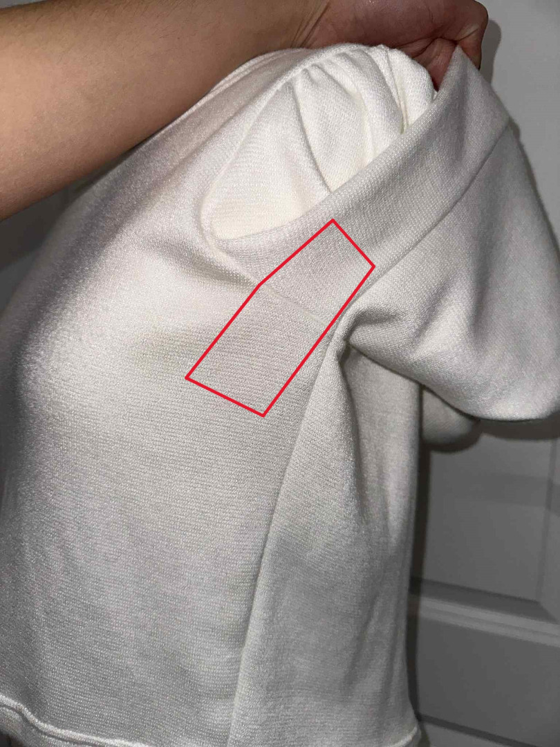 Sweterek posiada delikatne różowe zabarwienie materiału z boku pod pachą.