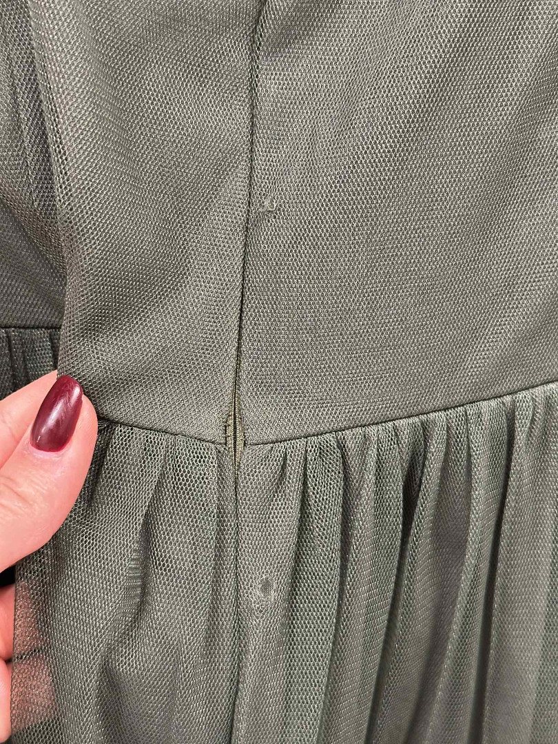 Zuri A362- zwiewna długa oliwkowa tiulowa sukienka na cienkich ramiączkach z wiskozy