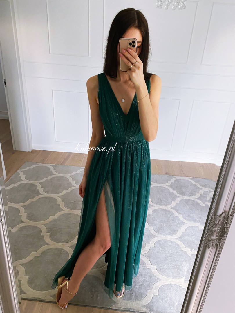 Paris - niesamowita sukienka maxi z tiulowego, brokatowego materiału z rozcięciem na nodze.