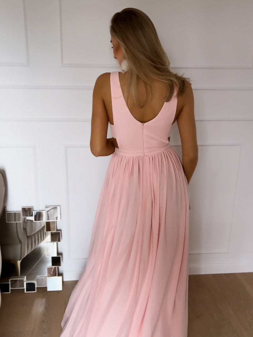 Niesamowita sukienka maxi ze zwiewnego, tiulowego materiału z rozcięciem na nodze.