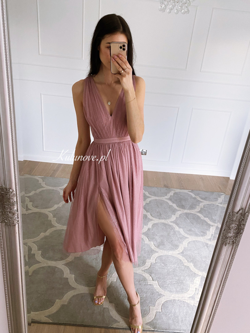 Niesamowita sukienka midi ze zwiewnego, tiulowego materiału z rozcięciem na nogę.