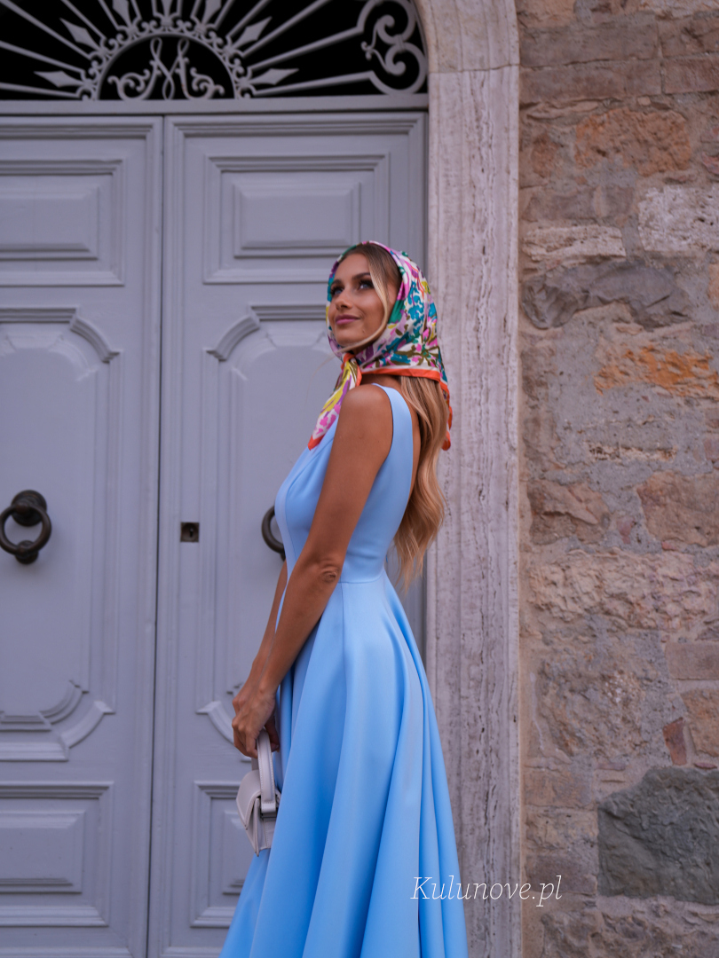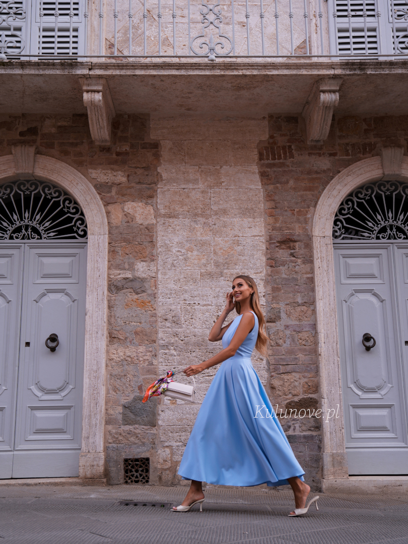 Sukienka midi w błękitnym odcieniu to propozycja delikatna, eteryczna, a jednocześnie pełna klasy.