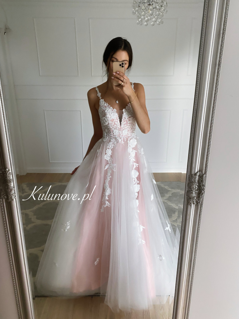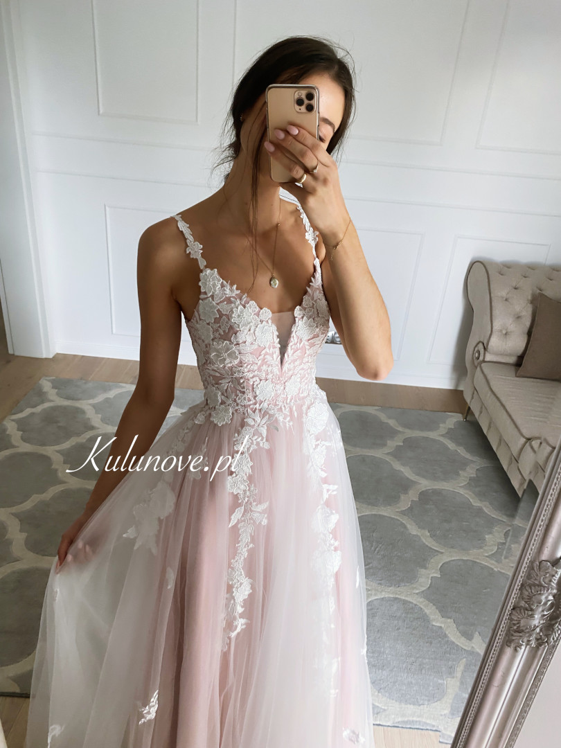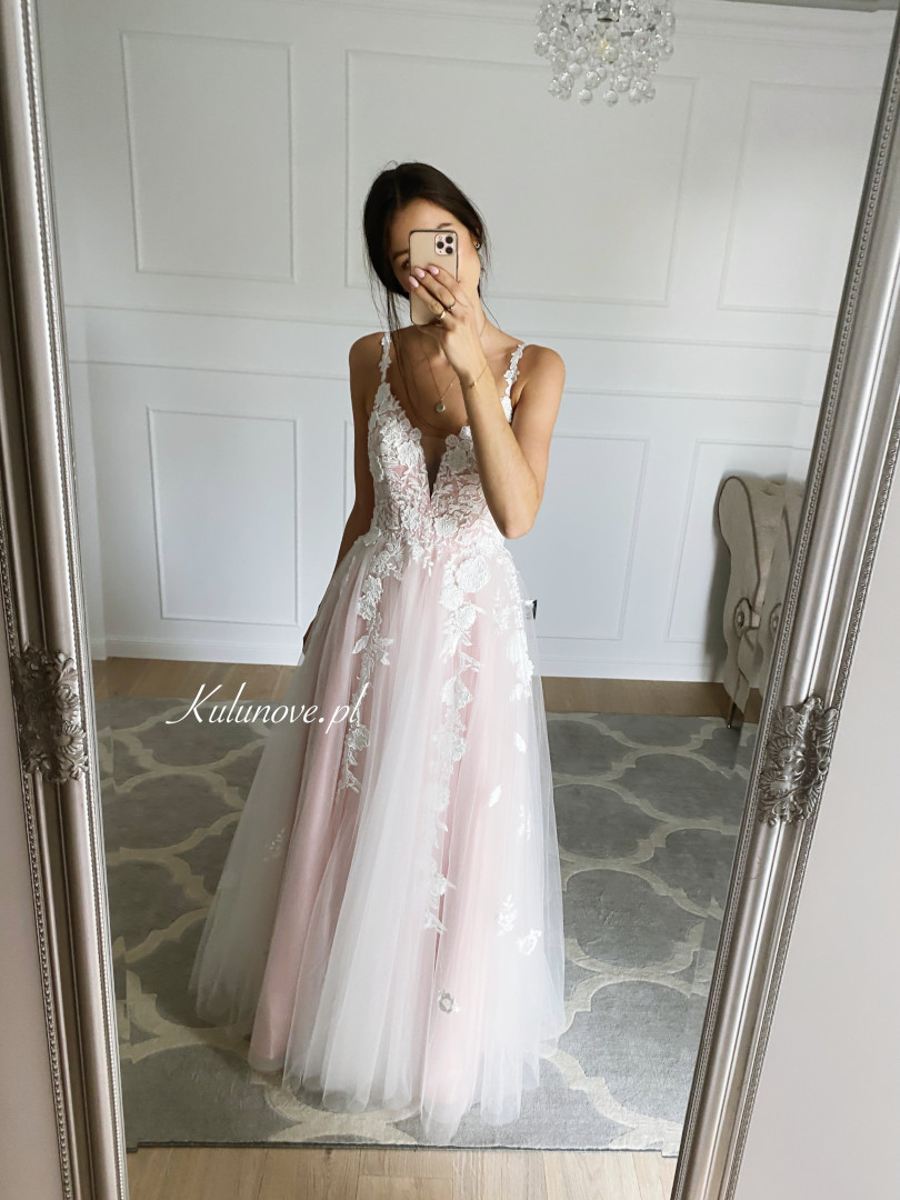 Niesamowita suknia ślubna w kolorze delikatnego różu.