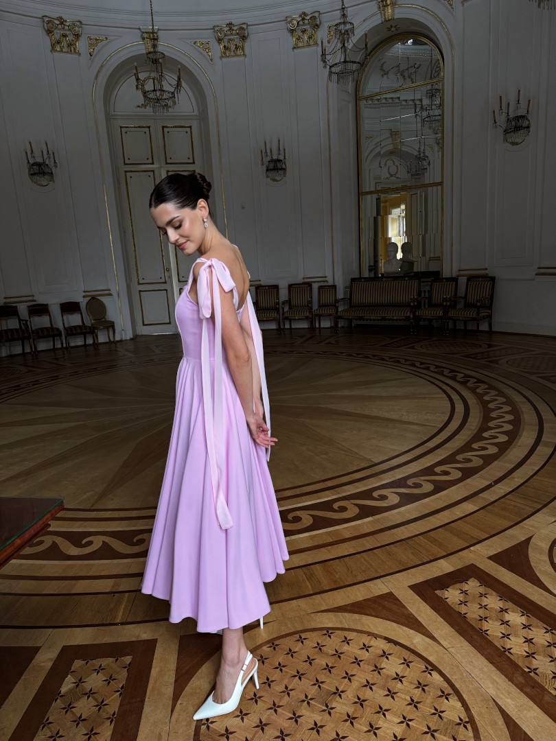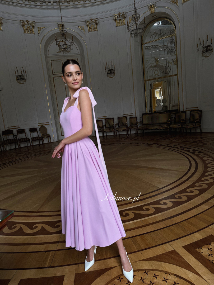Scarlet - jasnoróżowa rozkloszowana sukienka midi z wiązaniem na ramionach