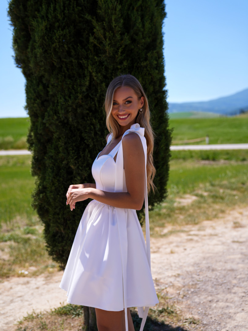 Sukienka mini z szerokimi ramiączkami i kokardami.