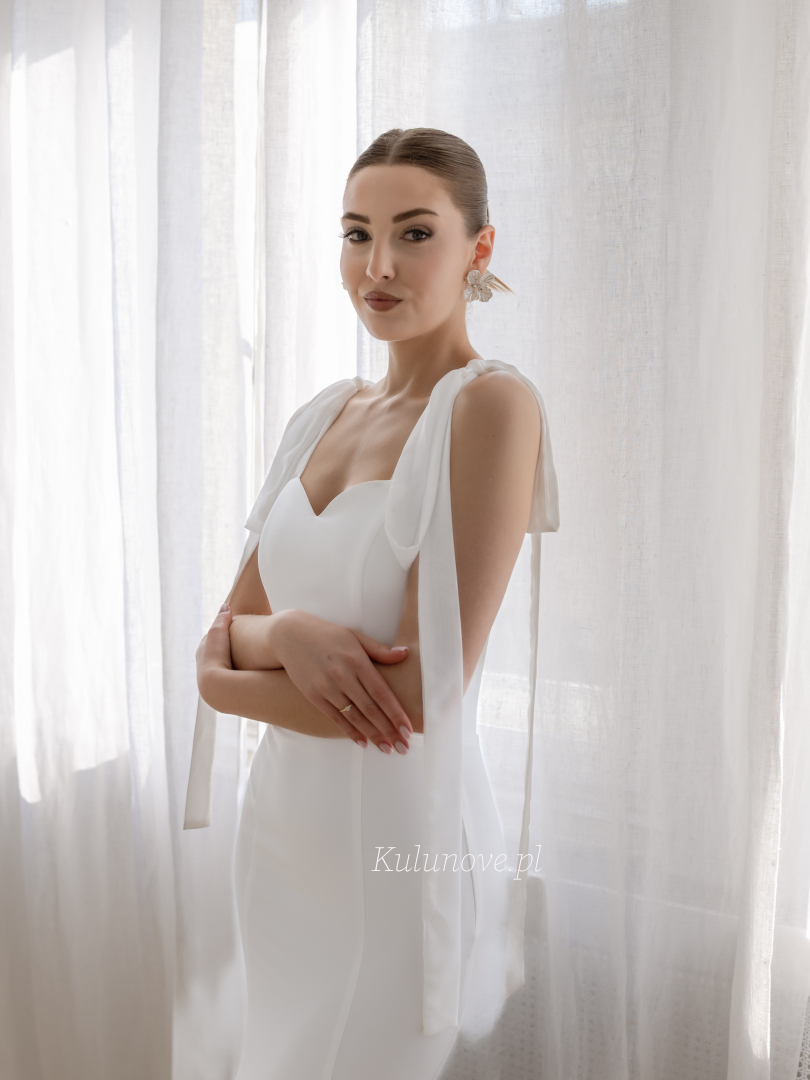 Scarlet rybka - ślubna dopasowana sukienka w kolorze ecru z dekoltem w serce uzupełniona delikatnymi szyfonowymi szarfami