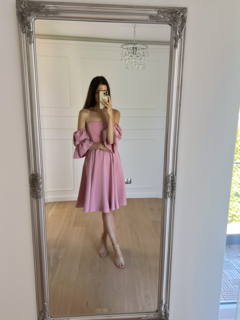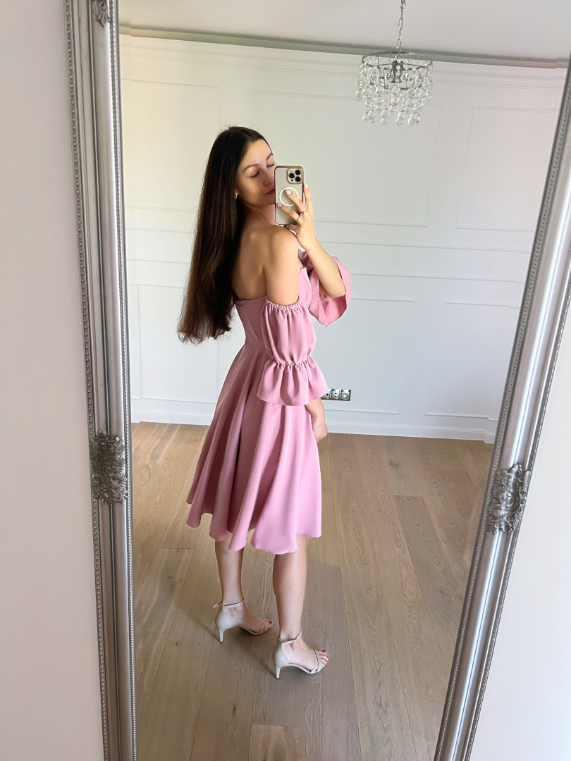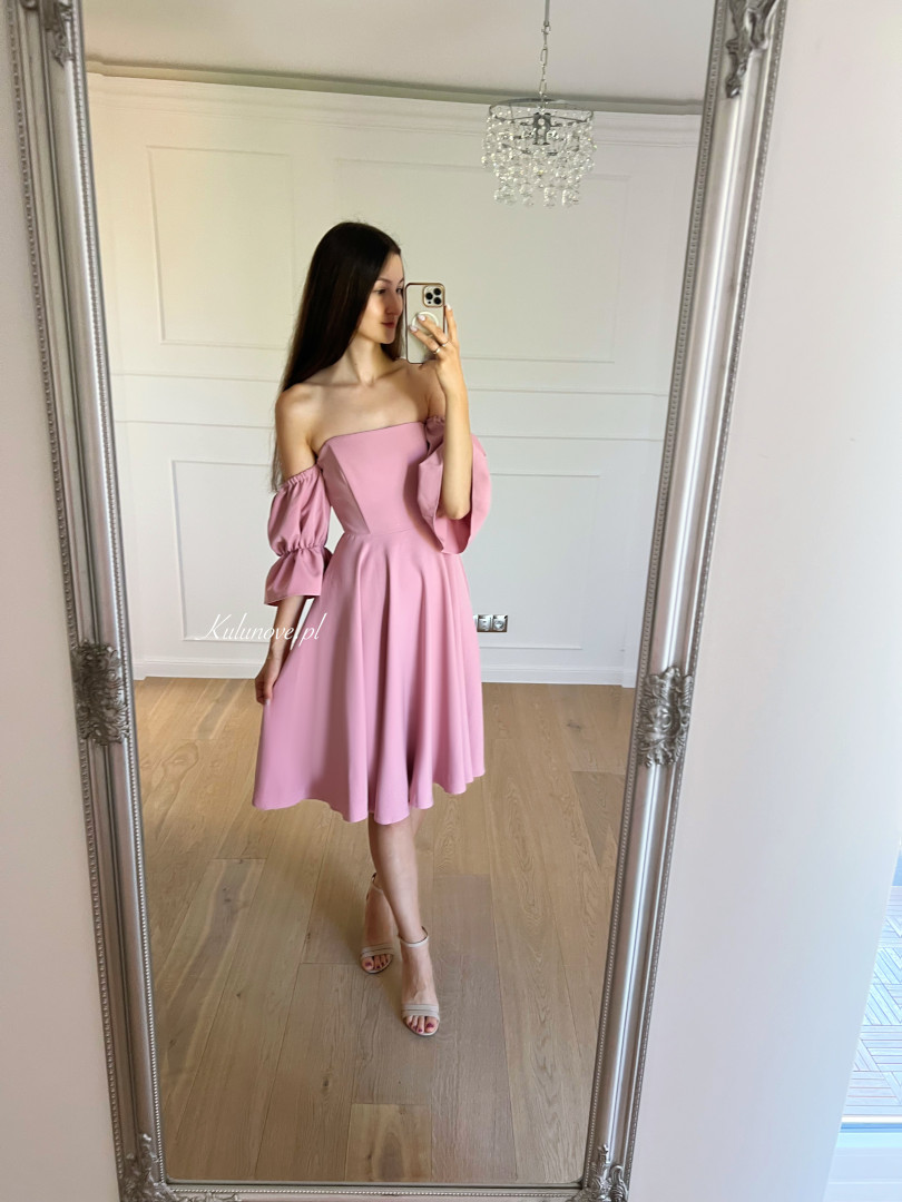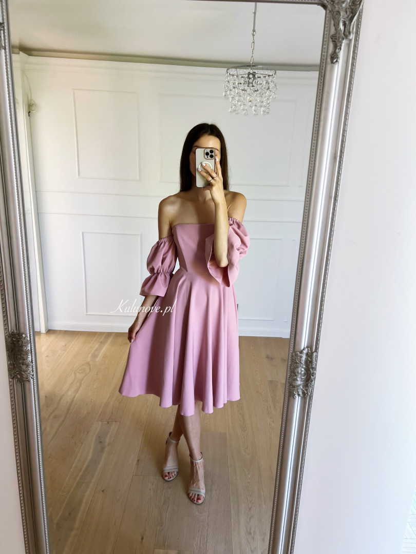 Seniorita midi - sukienka w kolorze ciemnego różu z opadającym ozdobnym rękawkiem