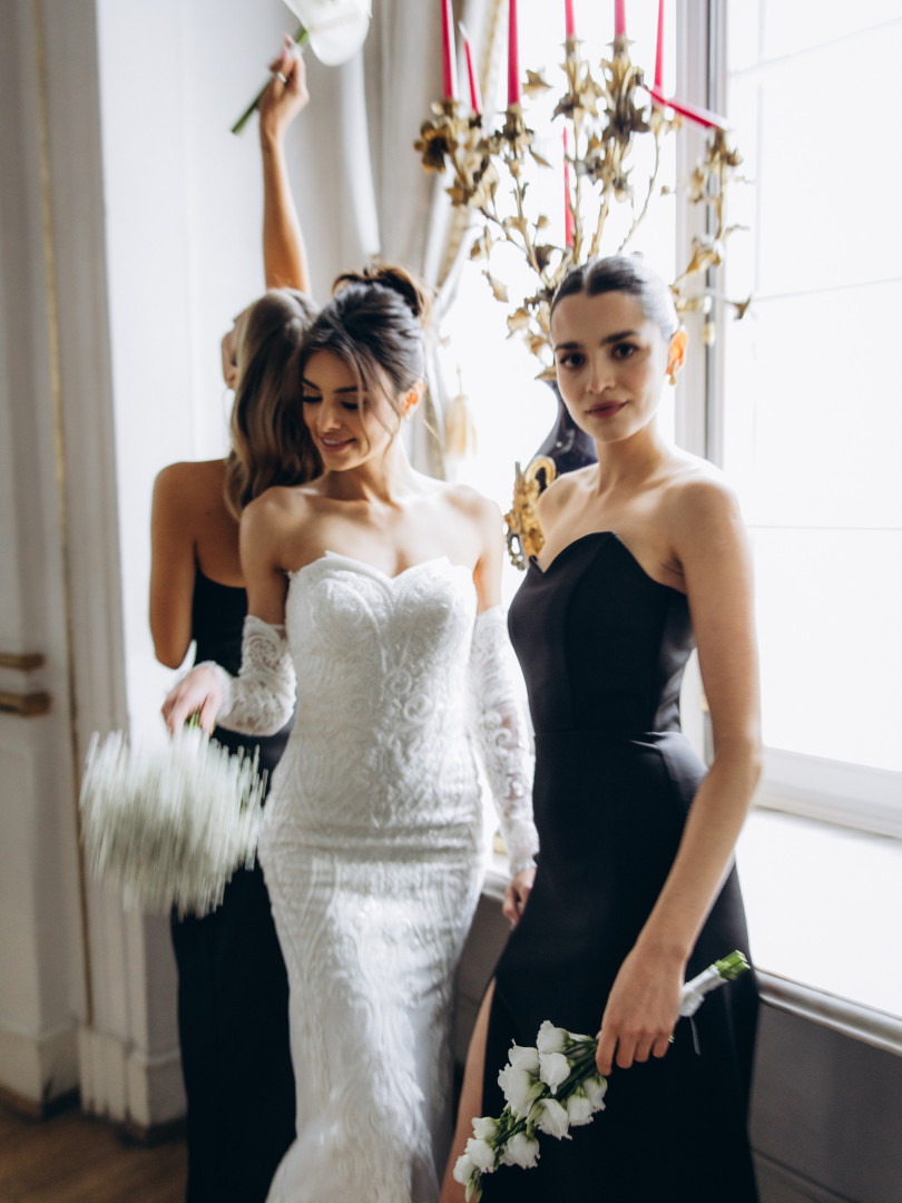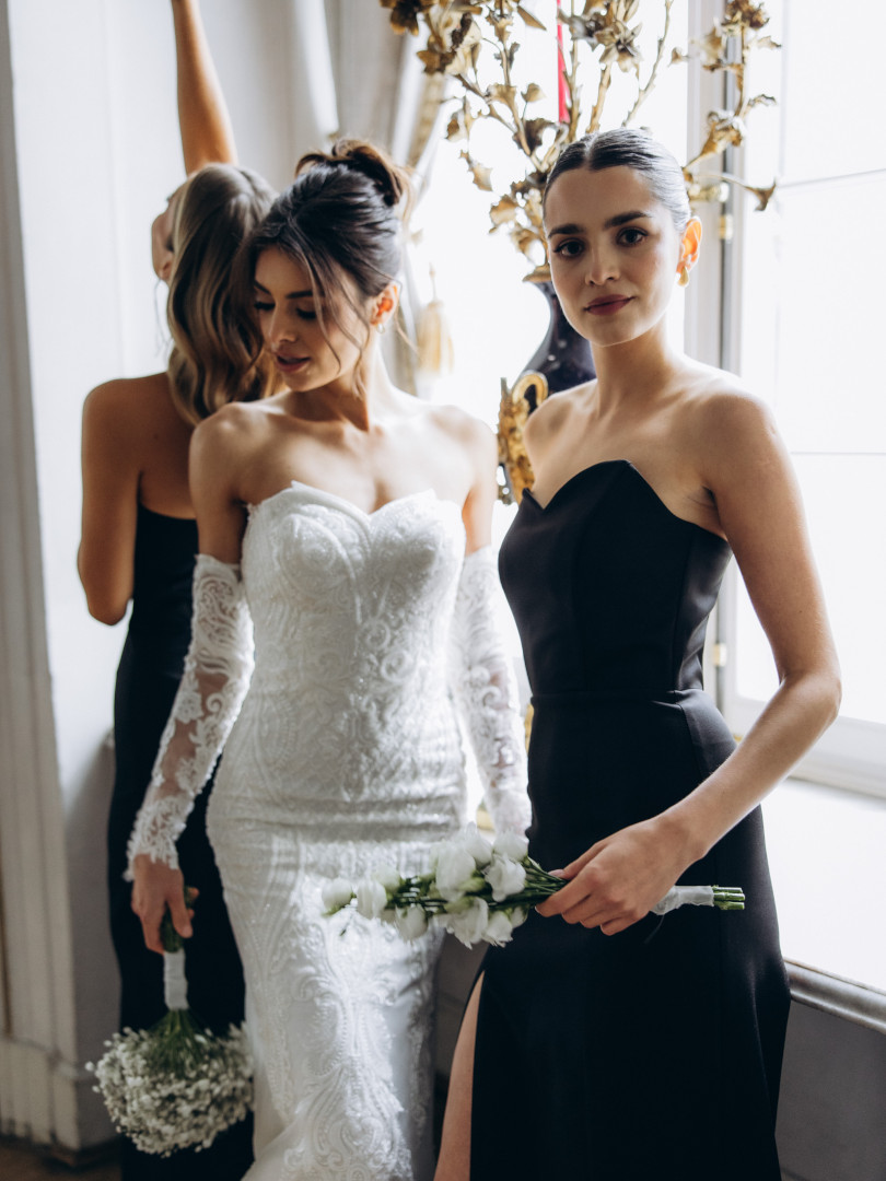 Seraphina - suknia ślubna premium bogato zdobiona koronką oraz koralikami z trenem i dodatkowymi rękawkami