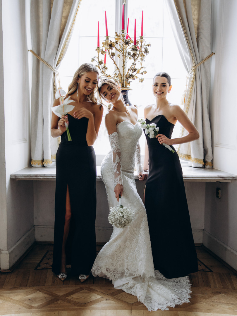 Dół sukni płynnie przechodzi w długi, zdobiony koronką tren.