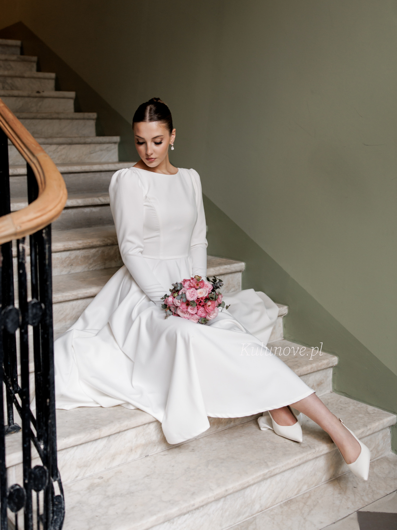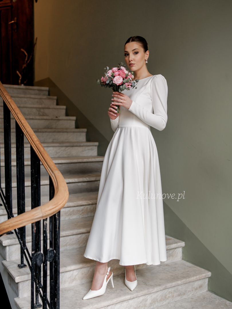 Długość sięgająca do połowy łydki nadaje jej lekkości i sprawia, że jest praktycznym wyborem na śluby plenerowe, w kameralnym gronie lub przyjęcia w mniej formalnej scenerii.