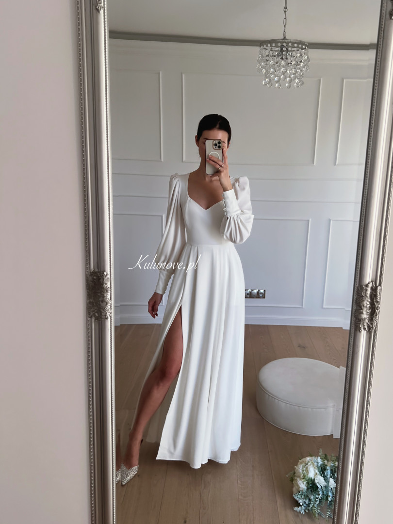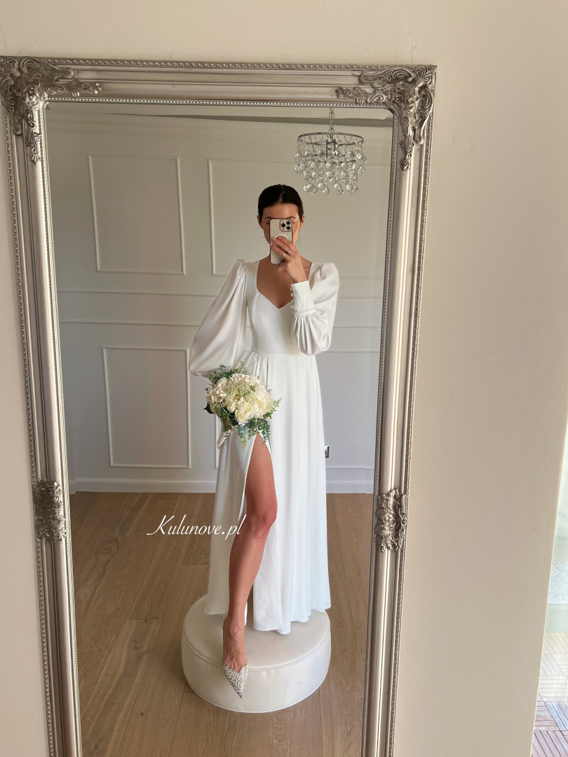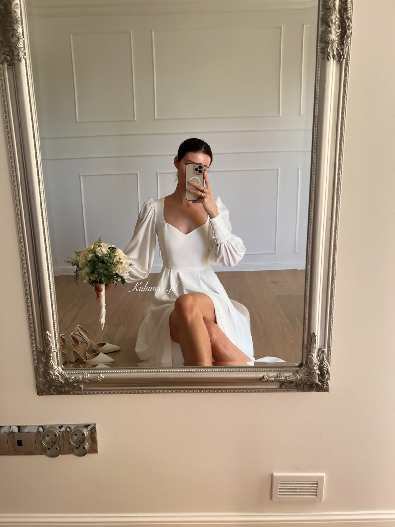 Bufiaste rękawy ozdobione zostały mankietem z guzikami (ok 67 cm długości).