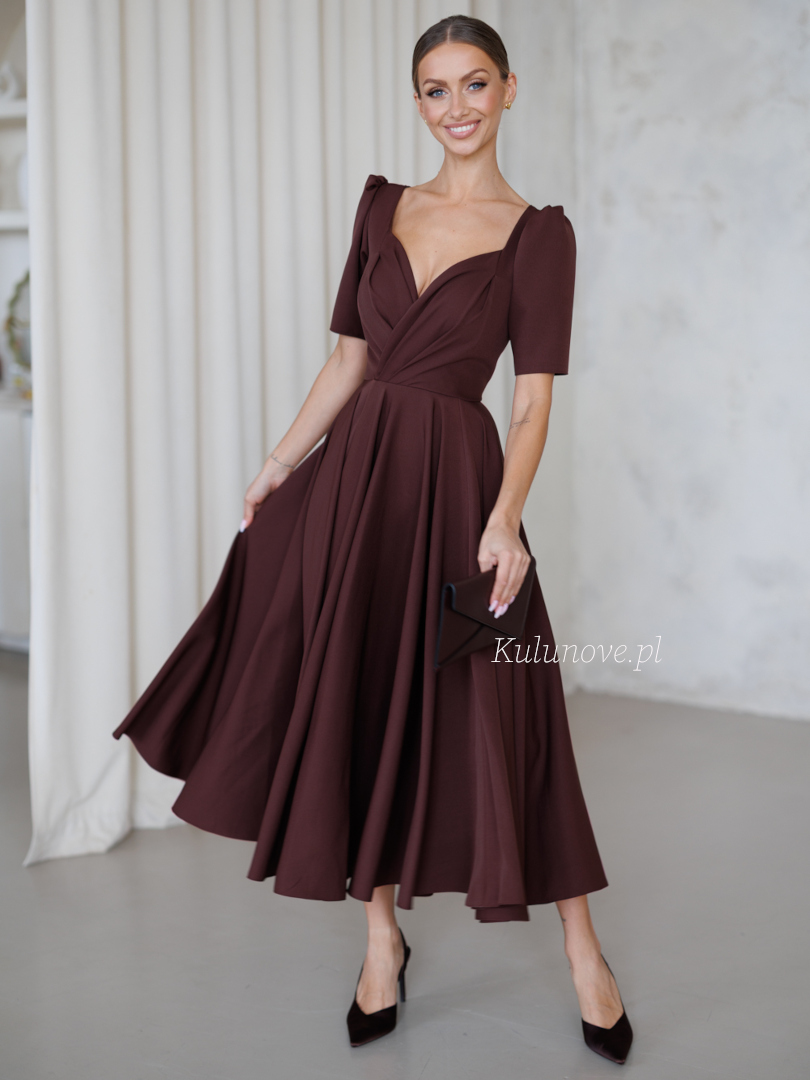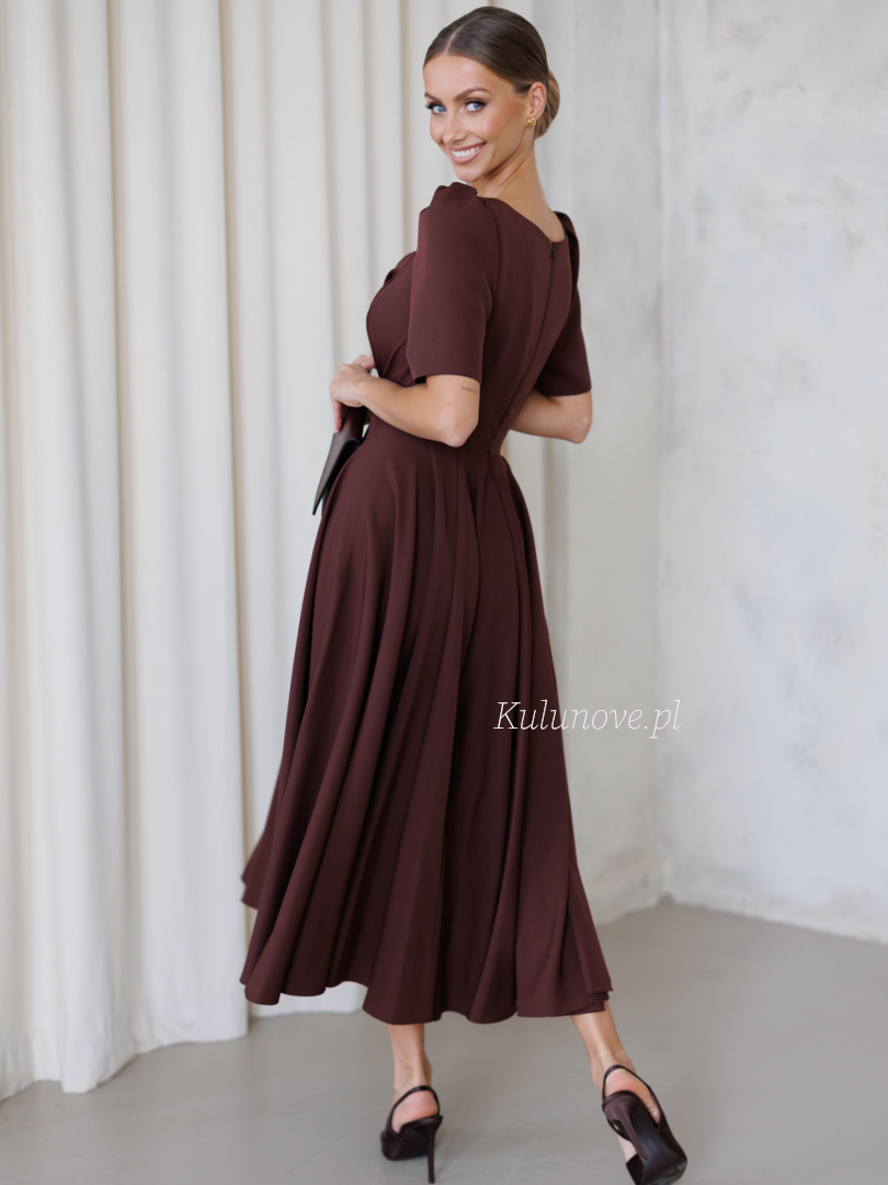 Czekoladowa Tina midi zachwyca ciepłym odcieniem i subtelną formą.