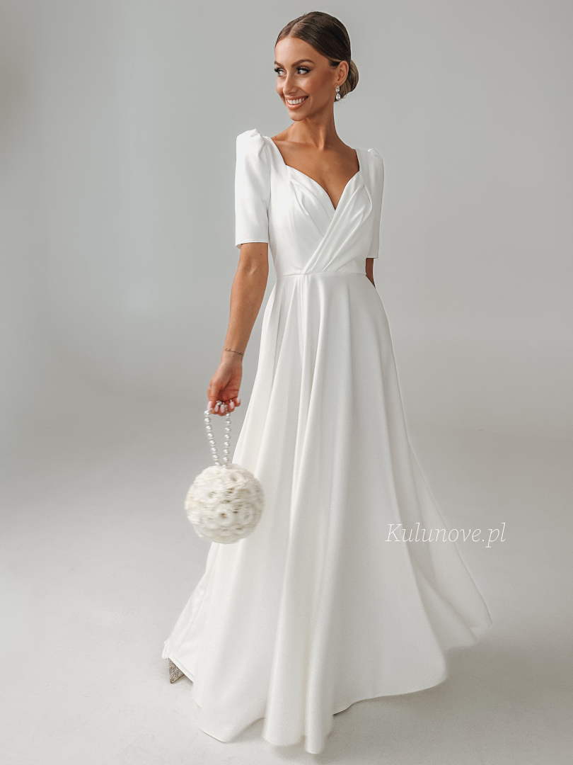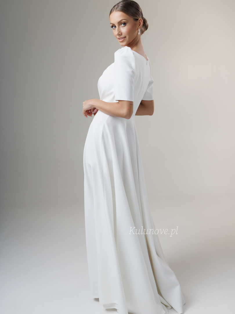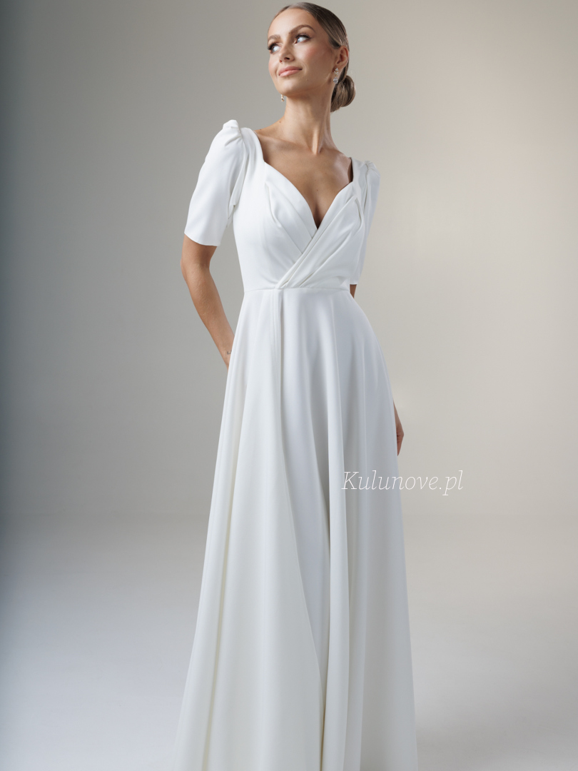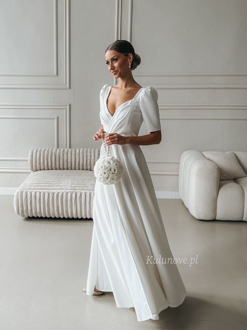 Tina - rozkloszowana suknia ślubna maxi z rozporkiem, dekoltem na zakładkę i krótkim rękawem
