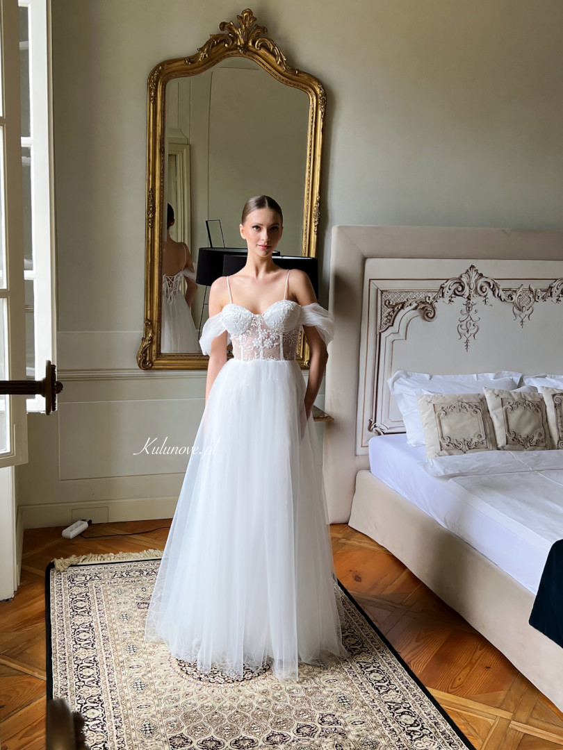 Vaiana - zwiewna tiulowa suknia ślubna gorsetowa w stylu boho z opadającym rękawkiem