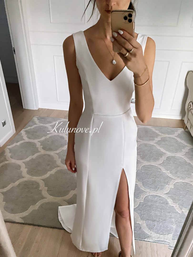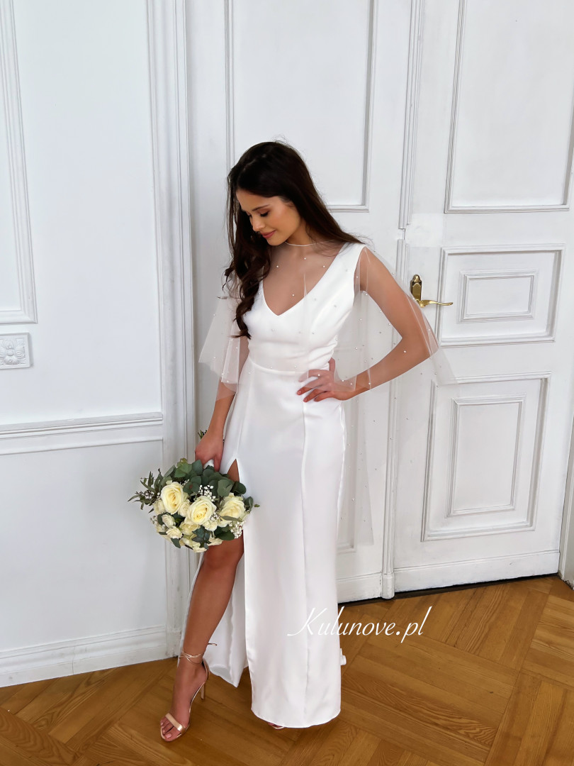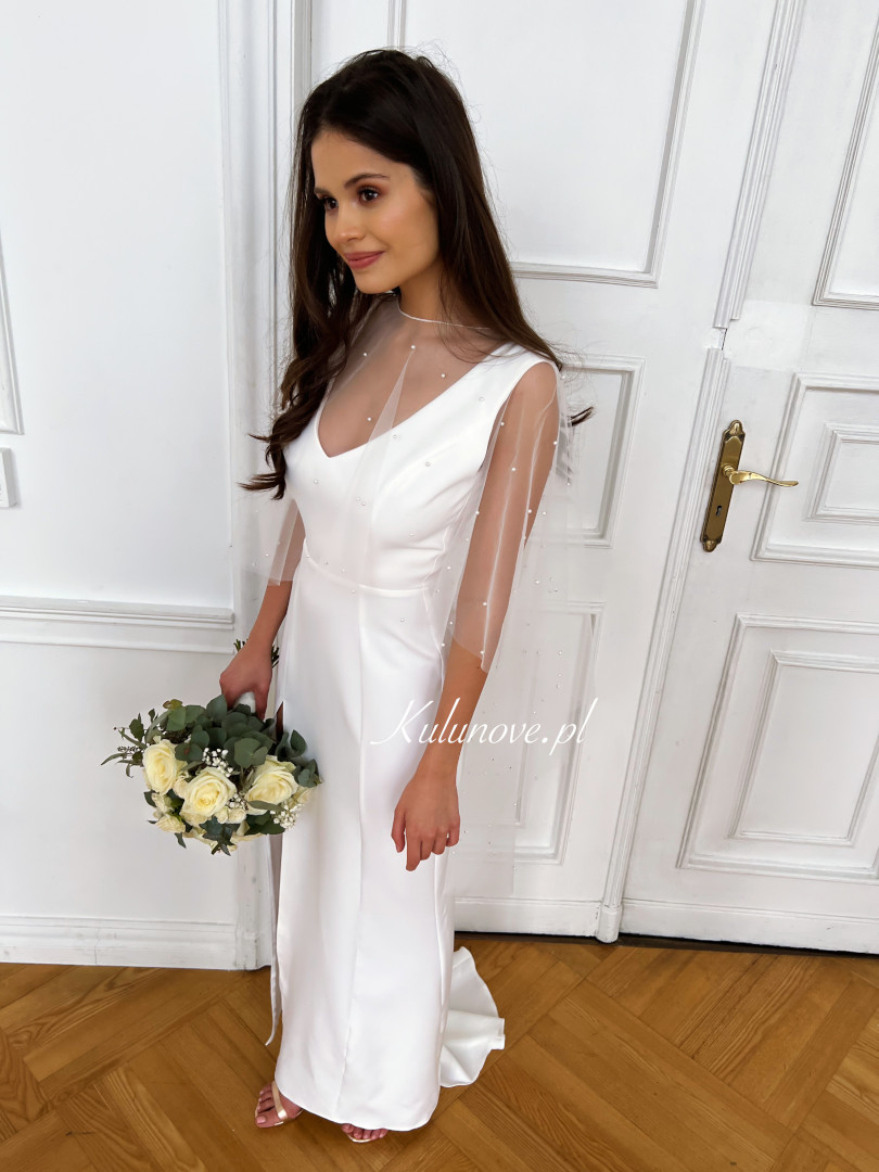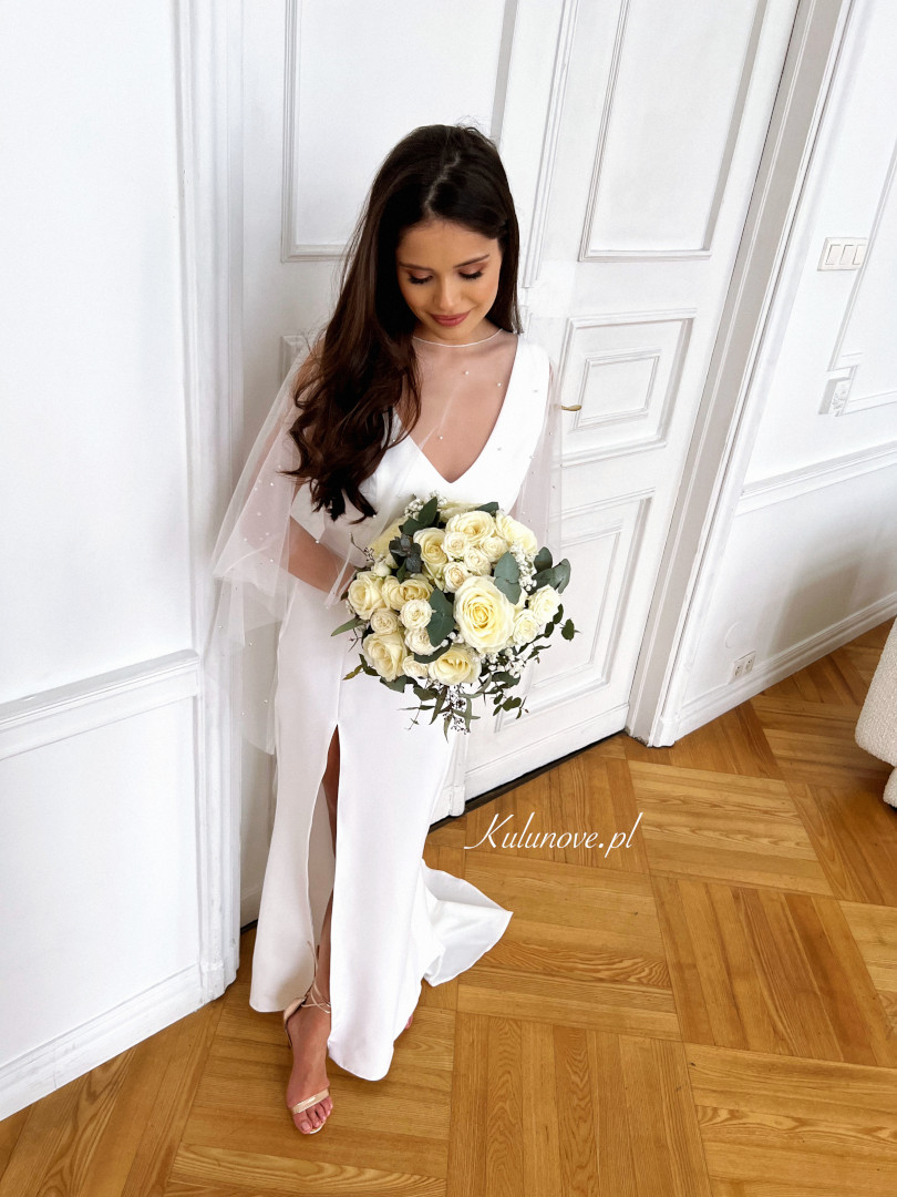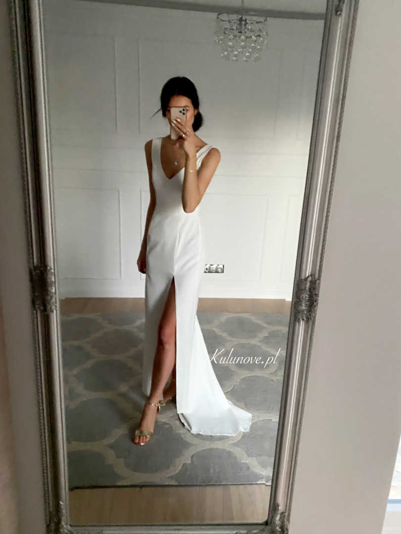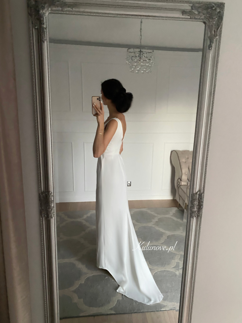 Prosta, klasyczna suknia ślubna z podpinanym trenem.