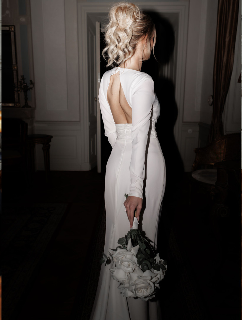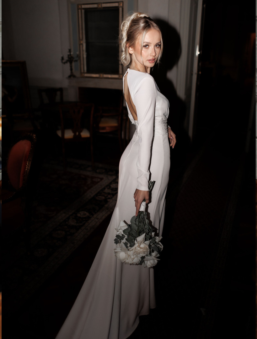 Prosta, minimalistyczna suknia ślubna na długi rękaw.
