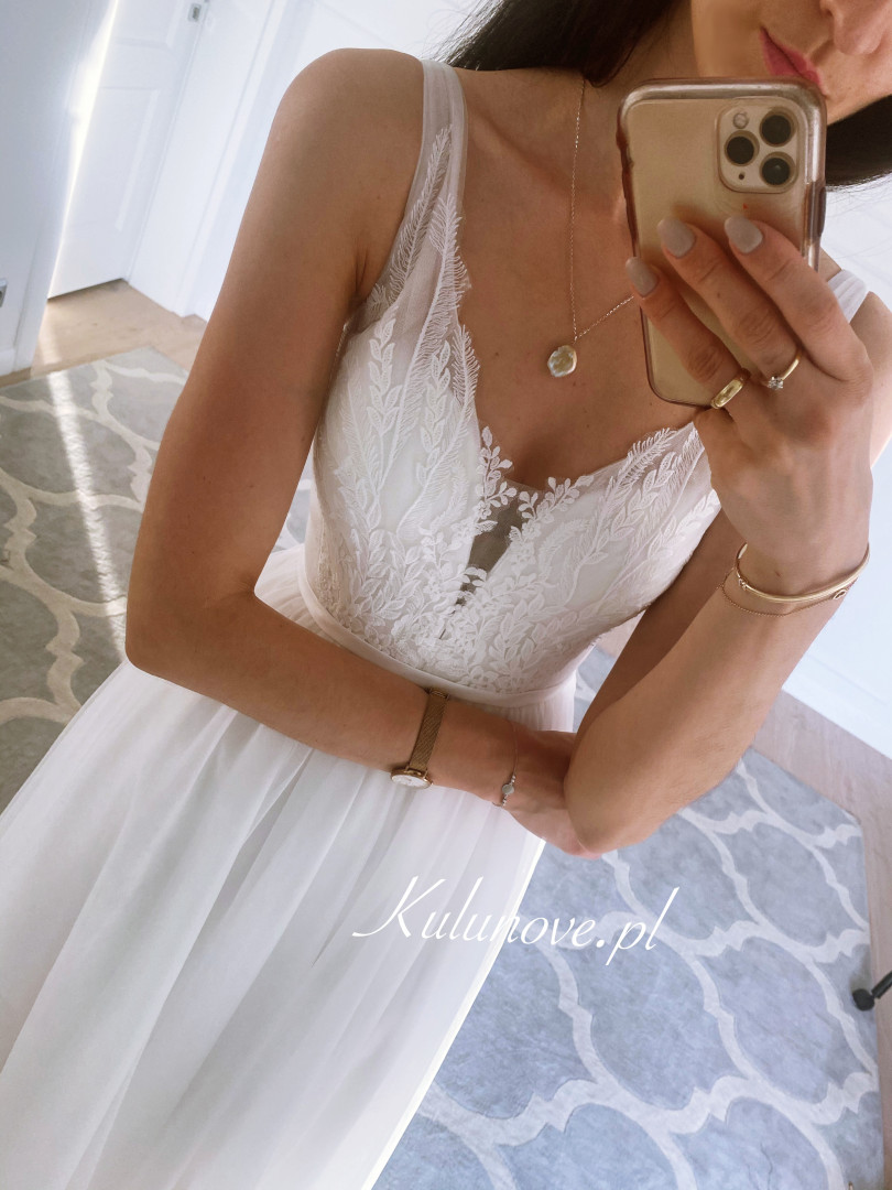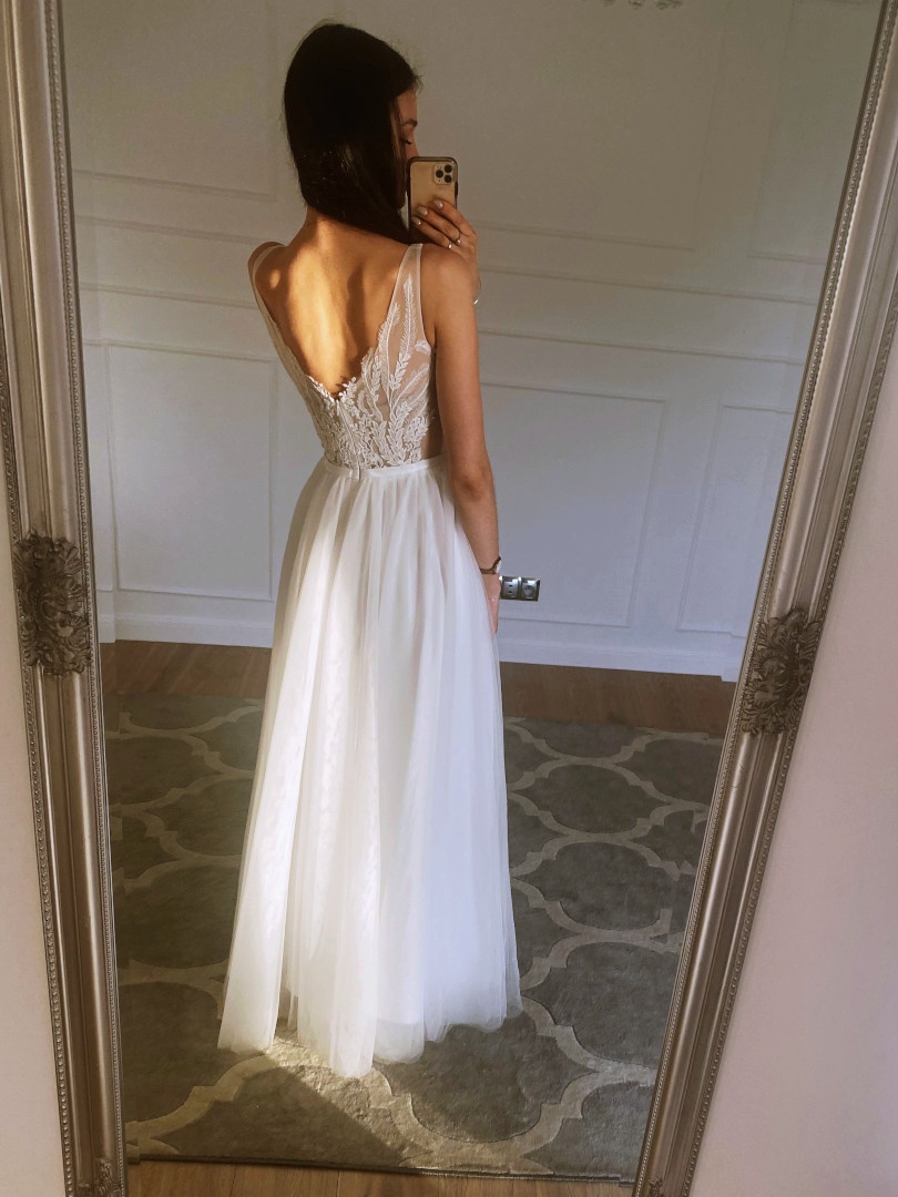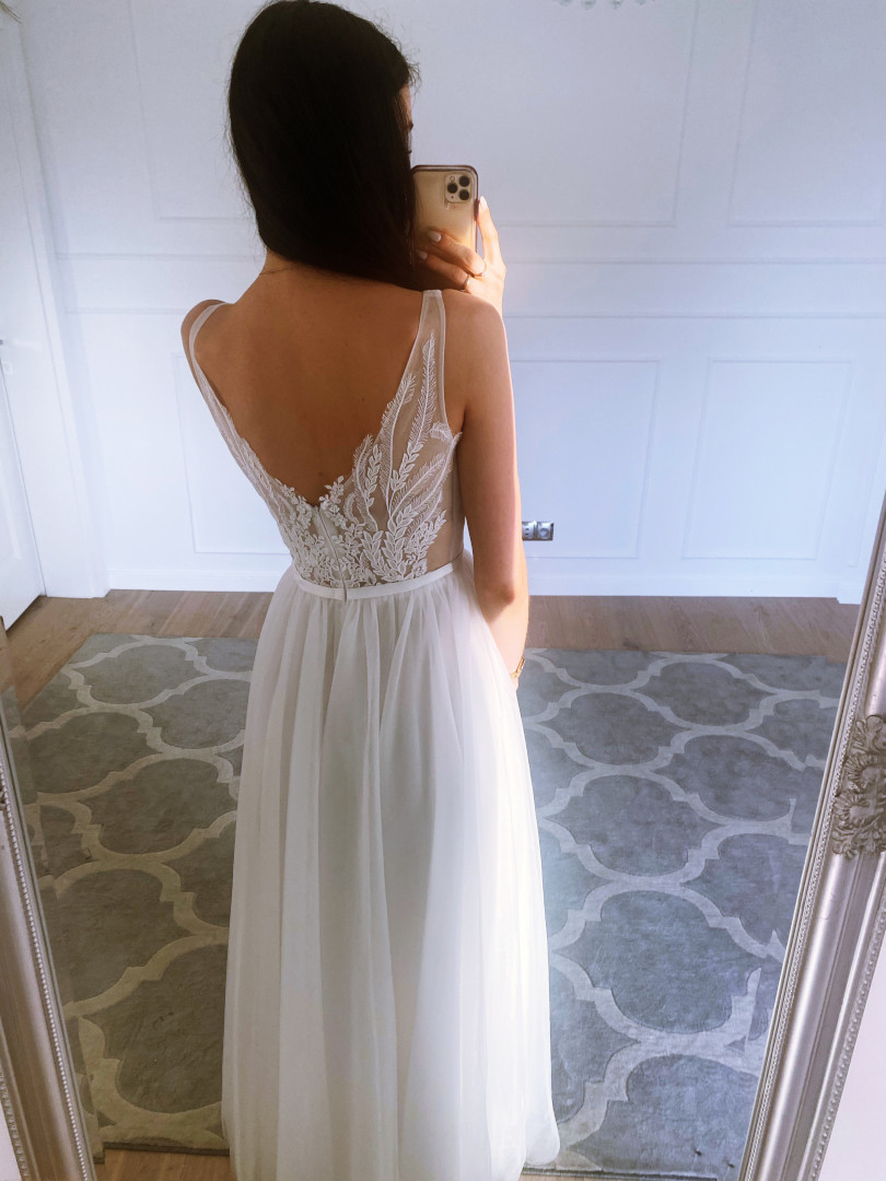Dół sukni to dwie warstwy tiulu oraz halka, dzięki czemu kreacja ma delikatną objętość.